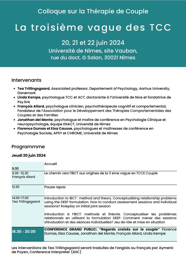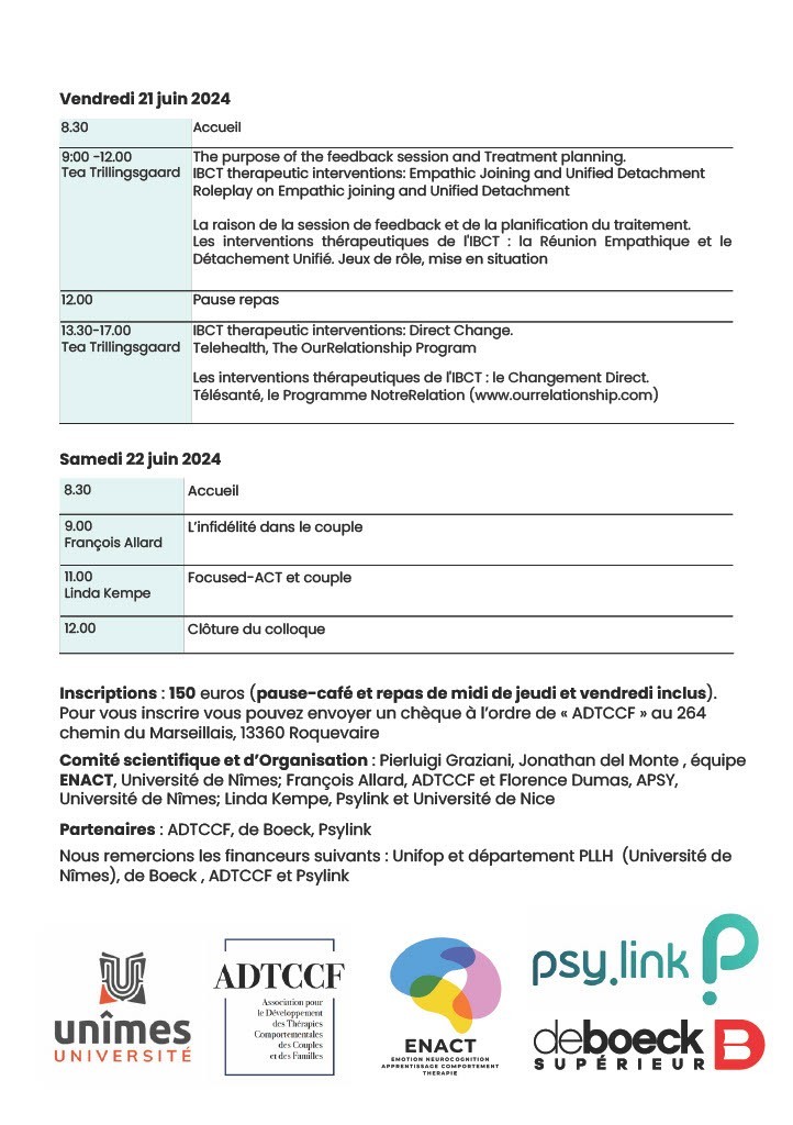 - Prise en charge du trauma à l’aide de la tcc, avec A.Sabouraud et A.Seguin, spécialistes reconnues dans le trauma, les 6 et 7 mars 2020. (Cf site pour s’inscrire)